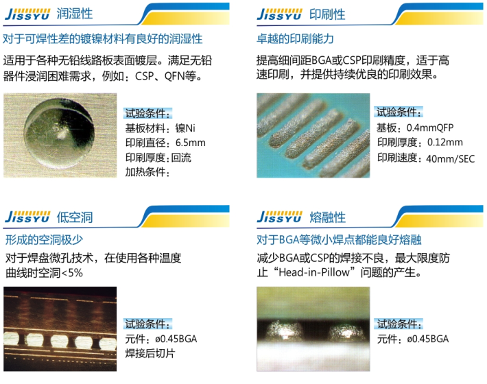 適應(yīng)超細工藝印刷和回流,擁有寬工藝窗口,為01005元器件提供表面貼裝工藝解決方案。在8小時的使用中均可提供卓越的印刷性能。出色的回流工藝窗口,使得其即使使用高浸潤曲線,對Cu OSP板仍可得到良好的焊接效果。對各種尺寸的印刷點均有良好的結(jié)合。優(yōu)秀的抗坍塌性能很好抑制不規(guī)則錫珠的產(chǎn)生。焊點外觀優(yōu)秀,易于目檢。空洞性能達到IPC CLASS Ⅲ級水平及IPC焊劑分類為ROL0級,確保產(chǎn)品環(huán)保和可靠性??勺畲笙薅鹊貪M足智能手機、平板電腦等產(chǎn)品對印刷性、可靠性、工藝效率等方面的高要求。
